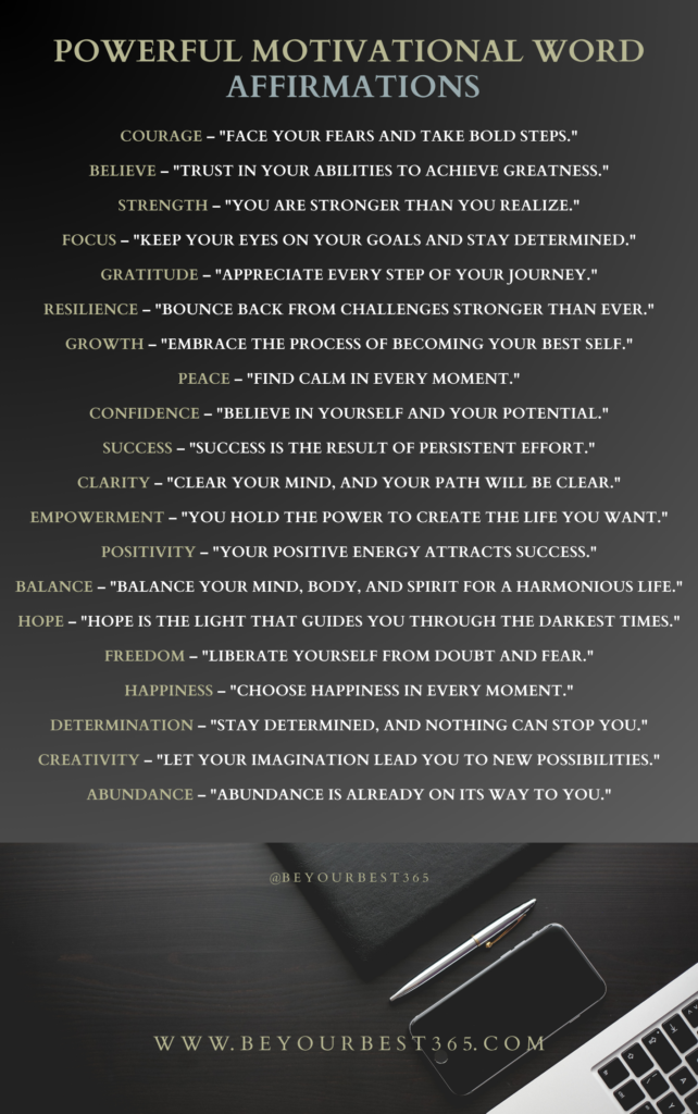 Unlock the power of positive thinking with this beautifully crafted collection of 20 Motivational Word Affirmations designed to uplift, inspire, and guide you toward personal growth and success.